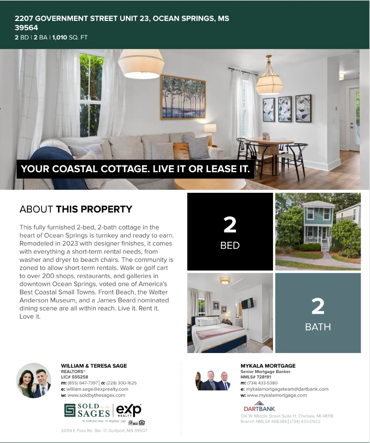 Step into easy coastal living with this fully furnished, income-producing 2-bedroom, 2-bath cottage nestled in the heart of Ocean Springs. Located in the charming Cottages at Oak Park community right on Government Street, this property is as practical as it is beautiful.